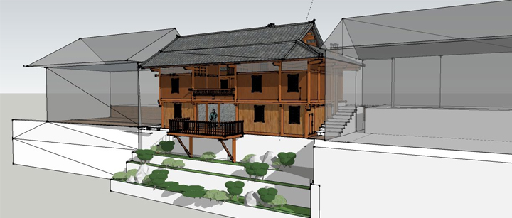 三开间左厢房餐厅楼上为办公区,右厢房为卧室,配备厕所,与一层对应。设备方面, 考虑配备射灯照明和 T5 管暗装二次反射,将电路系统穿金属管隐藏式暗装;给排水管道考虑与周边主管连接;暖通方面考虑预留空调机配电负荷。